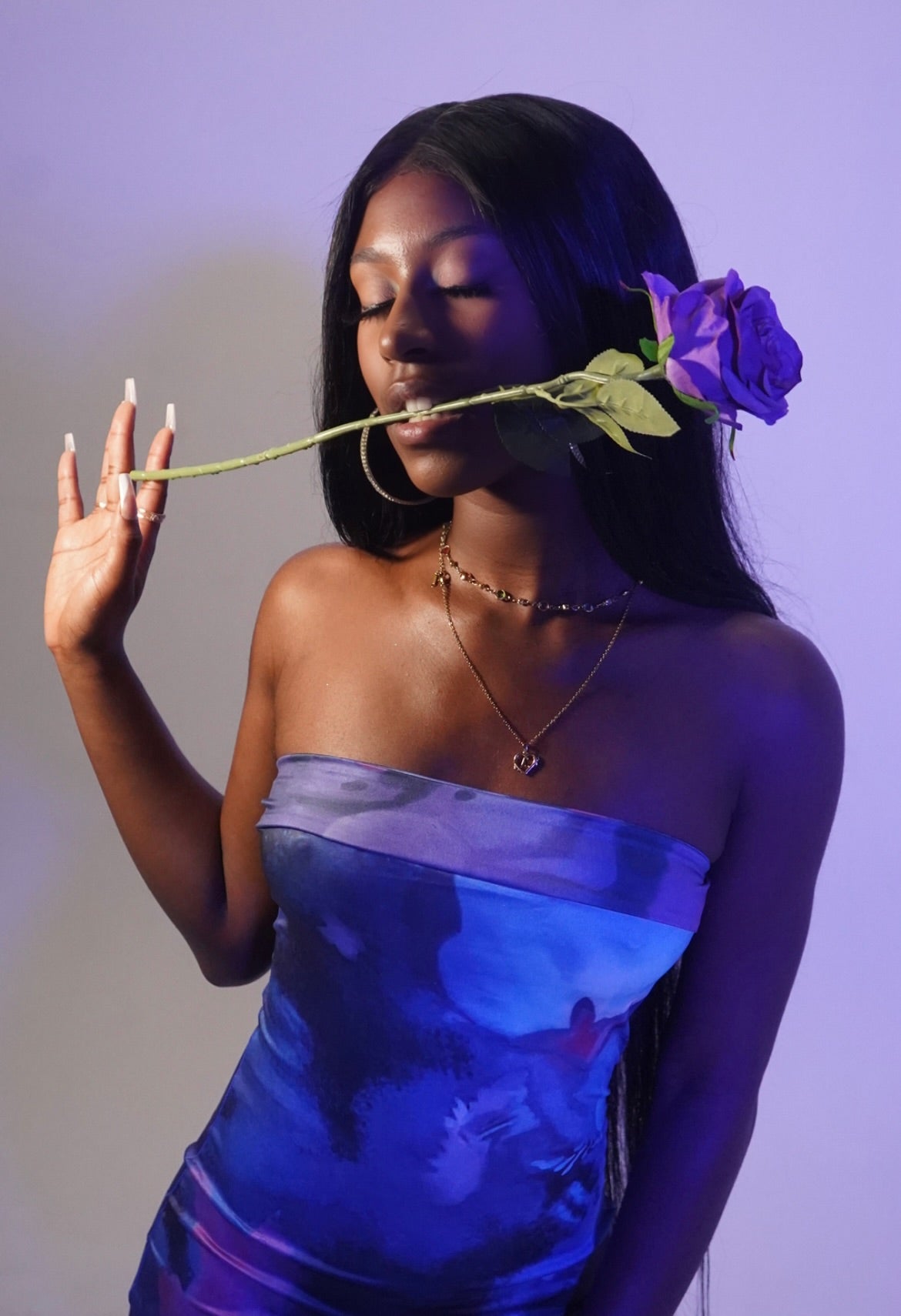 Mini, bodycon dress featuring a vibrant, abstract print in magenta, blue, and violet hues. Become the enchanting illusion of your dreams!